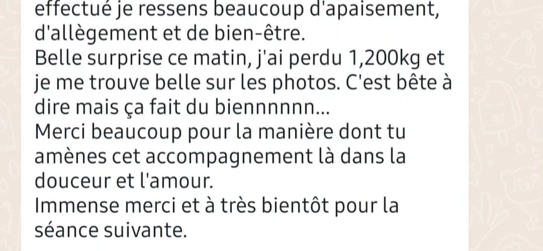 L’objectif principal n’est pas la perte de poids, mais la légèreté intérieure, l’apaisement et la reconnexion à toi. Les transformations physiques peuvent être une conséquence naturelle, mais elles ne sont ni promises ni garanties. Tout va dépendre de l'alimentation, de l'activité, plusieurs facteurs sont à prendre en compte.
